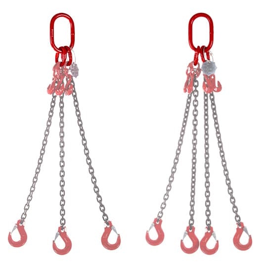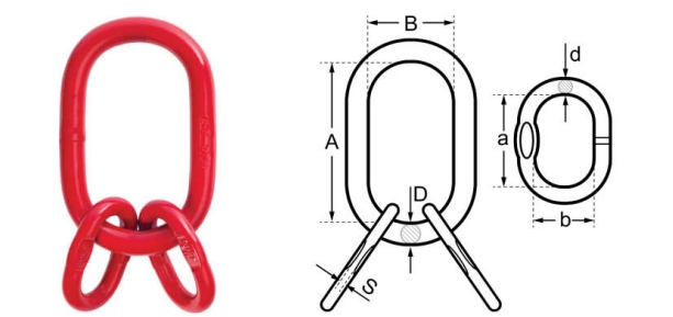 Heavy-duty Grade 80 alloy steel master link assembly with two sub-links for 3-leg and 4-leg chain sling systems. Proof tested, certified, red painted finish, available from 3.15 Ton to 63 Ton.