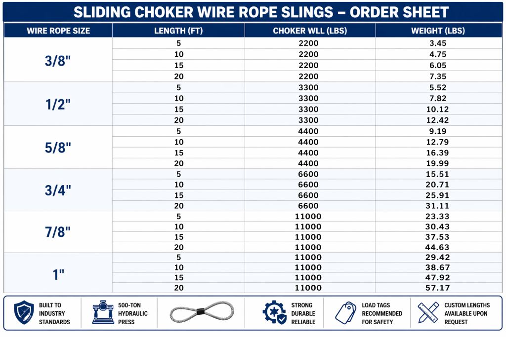 Sliding choker wire rope slings are purpose-built for overhead lifting—unlike logging chokers, which are not rated or approved for lifting. If you’re lifting and need a cable-style choker sling, this is the correct, legal solution. These single-leg slings feature a sliding choker hook for fast, secure choking around rebar, pipe, and other materials commonly handled on construction sites.